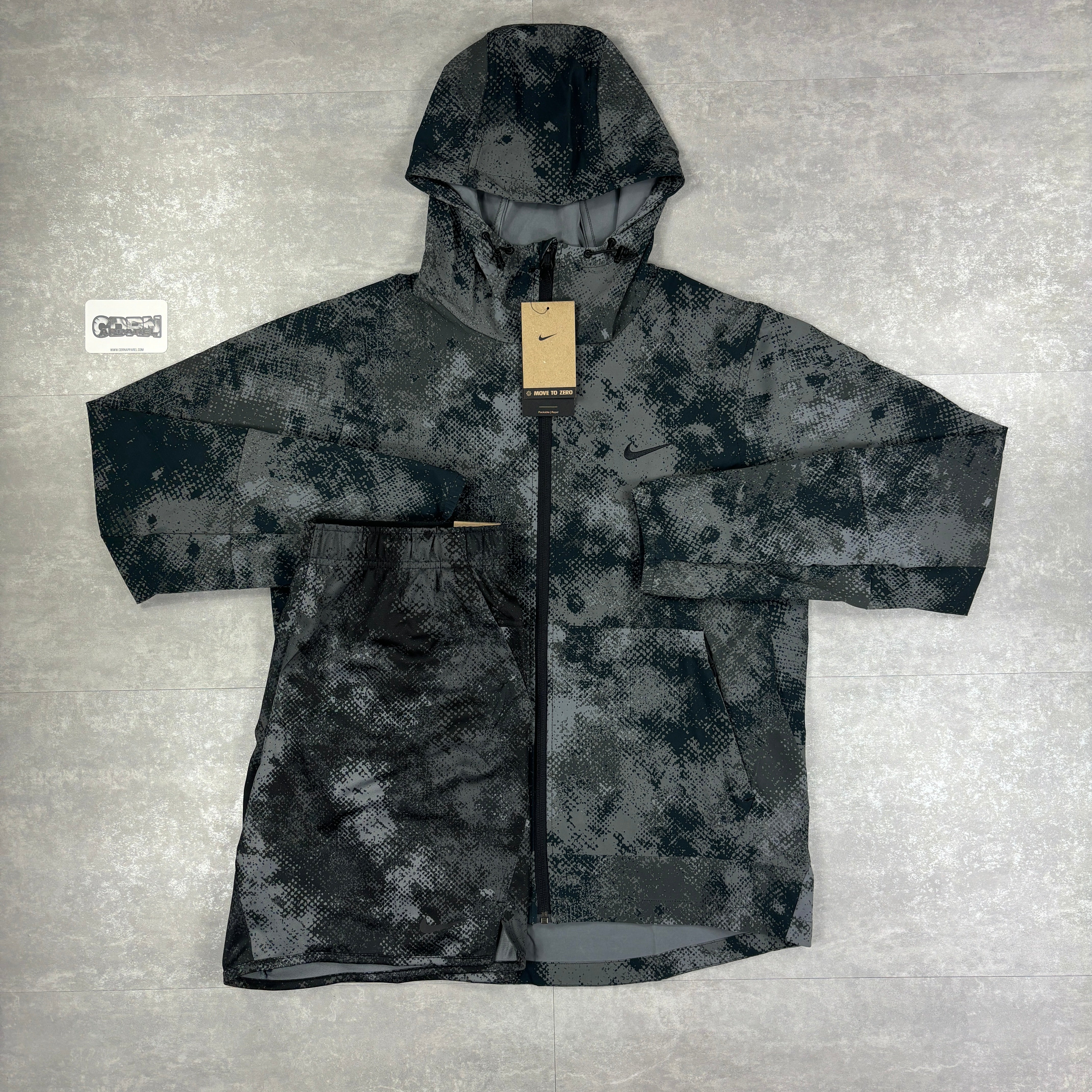 Nike Training Water Repellent Camo Jacket in Black. A lightweight jacket which can be packed away into the pocket. An adjustable draw cord hood with a stand up collar and full front zip opening featuring a Nike logo zipper. Elasticated sleeve cuffs. Two concealed zip entry pockets are situated on the waist. The signature Nike Swoosh logo is embroidered on the left of the chest in black. Nike Training Totality 7 Inch Unlined Shorts In Black. Standard Fit. Constructed in Dri Fit technology that moves sweat away from your skin and helps you stay dry and comfortable. An all over print in grey and black with a black interior elasticated waistband which features the signature Nike logo repeated in grey and a drawstring fastening. Two mesh lined pockets at the waist with the signature Nike swoosh logo printed on the left thigh in black. Side vents and top stitching in black. 100% Polyester.